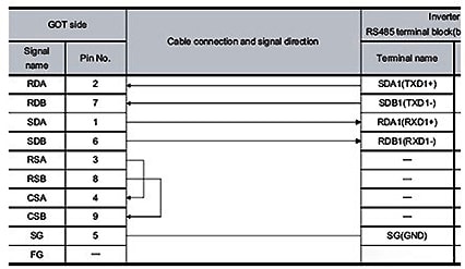 外部接線:三菱的觸摸屏手冊中講到了可以通過觸摸屏的422口和變頻器的485口直接通訊,這條電纜可以自已制作,接線圖如下:
