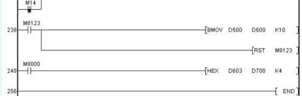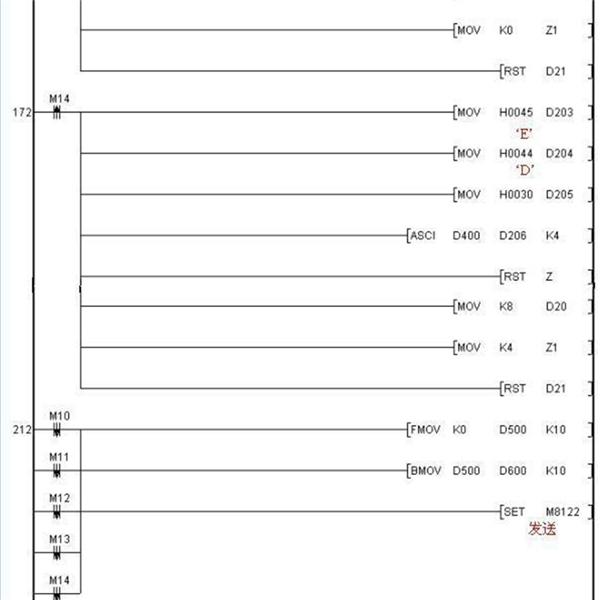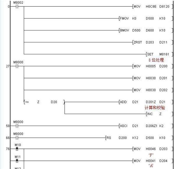 有關(guān)利用三菱變頻器協(xié)議與變頻器進(jìn)行通訊的PLC程序如下: