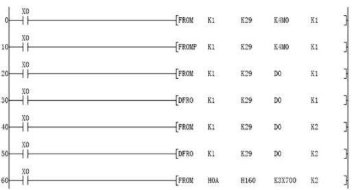 40行:當(dāng)X0=1時(shí),讀取1號(第1個(gè)K1)模塊緩沖區(qū)地址29(K29)和30中的數(shù)據(jù)保存到寄存器D0和D1中。