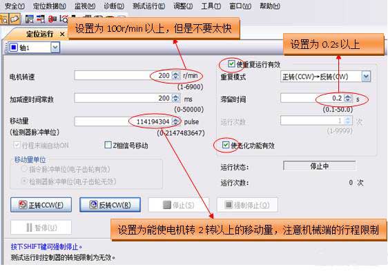 一鍵式調(diào)整需要在伺服電機運行中進行調(diào)整,因此,在進行調(diào)整期間,需要使伺服電機進行正反轉(zhuǎn)反復運行。可以先使用“測試運行”功能使伺服電機進行定位運行。