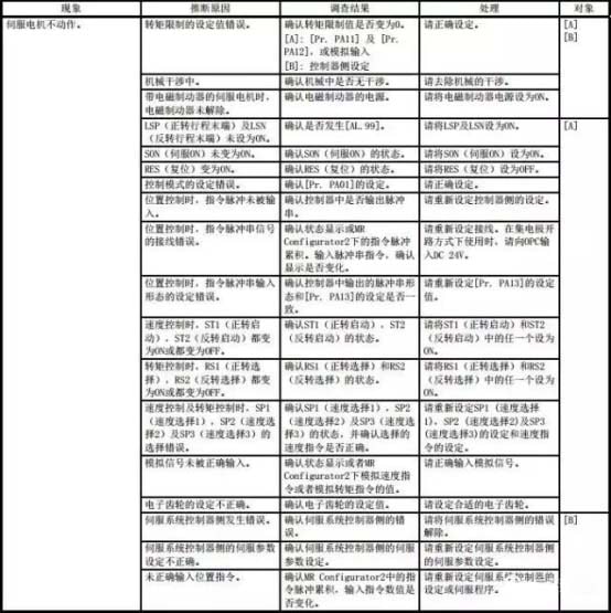 關于伺服電機不動作,可能的原因比較多,可以參考下表,逐一進行排查。