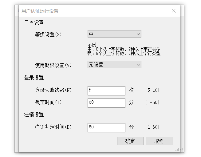 1.等級設置:可以規定口令的強度等級。(中:2種字符;強:3    種字符)