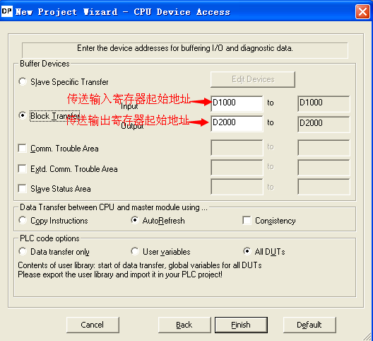 1、新建→2、選擇型號QJ71PB93D→3、下一步,如圖j,插槽位置、填寫從站站號,(如圖k)填寫從站輸入輸出寄存器數(shù)。