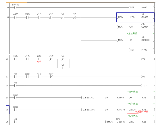 主站QJ71PB92V的程序:把主站要傳送給從站的數(shù)據(jù)寫進D2000-D2017,讀取從站的數(shù)據(jù)在D0。