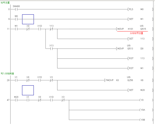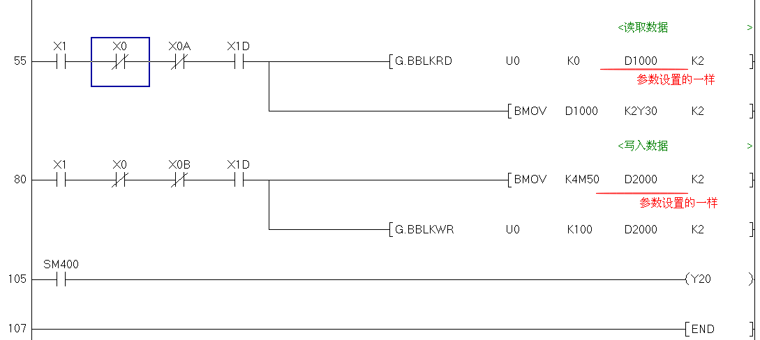 從站QJ71PB93D的程序:把寫給主站的數(shù)據(jù)寫進D2000-D2001,讀取主站的數(shù)據(jù)在D1000-D1001,