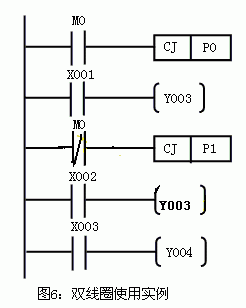 程序分析:M0閉合,程序跳至P0處(不執行X001語句),M0常閉斷開,CJ    P1不會發生,執行下一語句。此時,Y003將X002狀態進行驅動。M0斷開時,程序順序執行并按X001的狀態對T003進行驅動,M0常閉閉合,跳至P1按X003狀態對Y004進行驅動,即跳過了X002驅動Y003的語句。可見,在同一時刻,Y003驅動只有一個可以發生。此時,雙線圈利用是可以的。