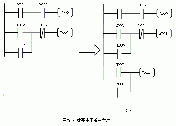 圖(b)中,X001和X002接點控制輔助繼電器M000,X003~X005接點控制輔助繼電器M001,再由兩個繼電器M000,M001接點的并聯組合去控制線圈Y000。這樣邏輯關系沒變,卻把雙線圈變成單線圈。