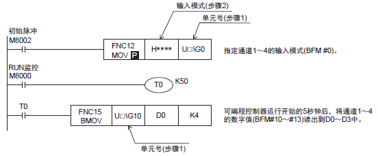 2)、將4AD中輸入的模擬量數據保存到三菱可編程控制器的數據寄存器(D0~D3)中。