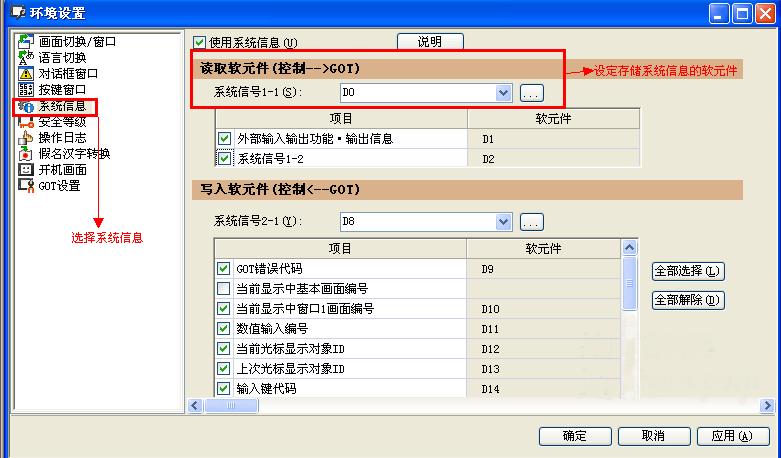 點(diǎn)擊菜單欄中的“公共設(shè)置”中的“GOT環(huán)境設(shè)置”選擇里面的系統(tǒng)信息,打開系統(tǒng)信息對(duì)話框,如圖所示: