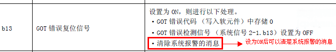 系統(tǒng)信號(hào)1-1中每一位都有其相應(yīng)的意思,詳情請(qǐng)參看三菱觸摸屏手冊(cè)公共篇中系統(tǒng)信息內(nèi)容說明中的介紹,在這里面我們需要清除這些報(bào)警信息,必須把D0中的b13位置為ON,b13位的作用如下圖所示。