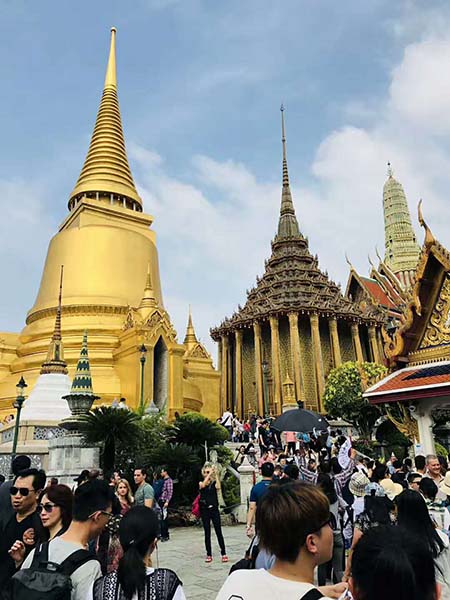 第一站:首先是到泰國必游的大皇宮與玉佛寺,游大皇宮和寺有許多的禮儀規(guī)矩,如:在入大皇宮時(shí),不能穿拖鞋,上衣不能穿無袖下身著裝必須蓋過膝蓋,入寺廟需脫鞋等等,不過在此之前海藍(lán)的小伙伴早就做好相關(guān)的功課,當(dāng)然是順利進(jìn)行游玩,小編提醒:還沒去過泰國旅游的小伙伴在去泰國一定要做好相關(guān)功課,了解當(dāng)?shù)亓?xí)俗文化,不然會被擋在門外喲!