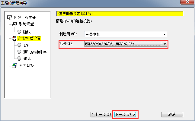 2.1.4 設置連接機種類型,需根據機種選擇,后單擊[下一步]
