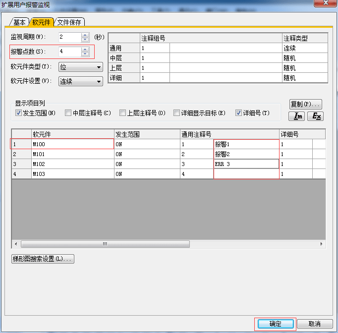 2.3.3 擴展用戶報警監視-軟元件設置,設置完后單擊[確認]